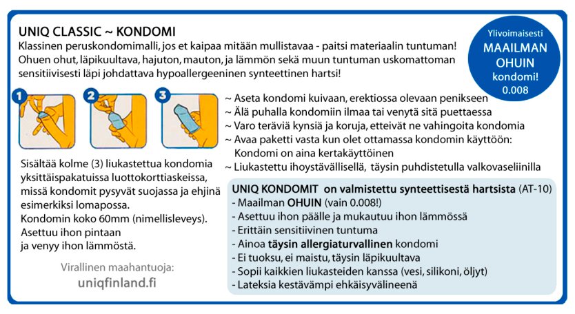 – Maailman ylivoimaisesti ohuin kondomimateriaali: 0.008
